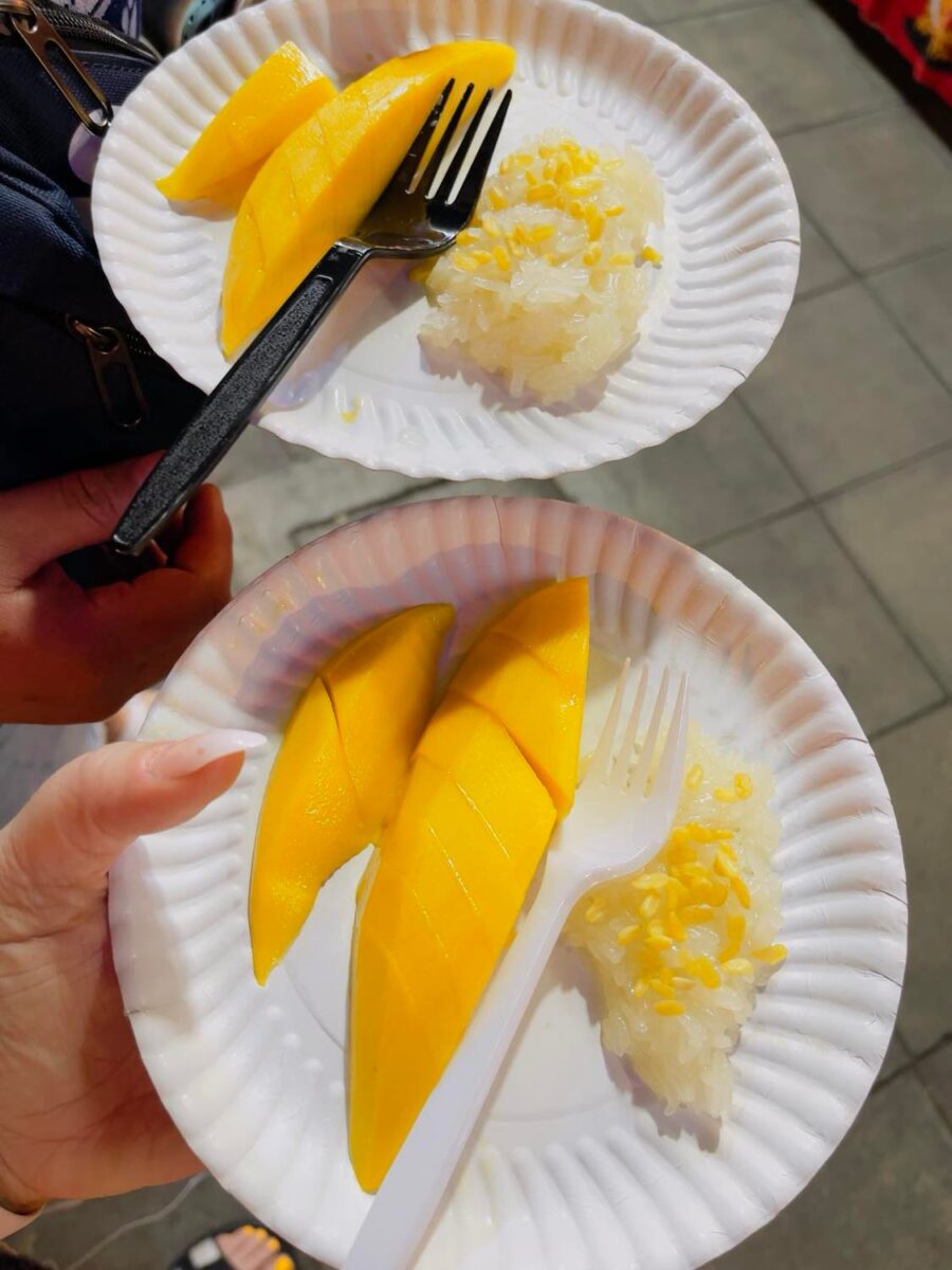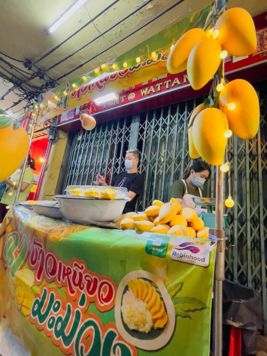 Our first stop was sharing an entire typical Isan food from northeast Thailand. Plenty of food, so make sure you come hungry. The flavors were intense, and we couldn’t get enough. Our next stop was dessert. You got it, their famous Mango Sticky Rice. THE BEST and sweetest mangos I have ever devoured. It was definitely a savory treat that had our taste buds dancing. Then there was ubiquitous pad Thai and stir-fried sukiyaki, which were equally delicious. By this time, we were stuffed full. More food??? YUP. Our final culinary destination was the Michelin-starred Ann Guay Tiew Khua Gai, where we indulged in their famous fried noodles with crispy fried egg and chicken skins, along with the most delicious sauces. It was a meal to remember. The food was prepared in the back alley, yes you read that right. They do not have kitchens in most restaurants due to fire precautions. It was so neat to watch them cook our meals with high flames and laughter. Next we ventured to the Pak Klong Talat Flower Market, where we learned how to fold lotus petals into a beautiful masterpiece. It was a unique experience of magic in the night. Chinatown was a site to see with all the jumbled wires dangling off buildings, burnt business’ from those same wires. On one corner, was a small cart where they prepared our last sweet treat. We tried banana roti street side. The roti was a thin dough fried with bananas inside and drizzled with chocolate, served hot. Very delish if you like bananas.